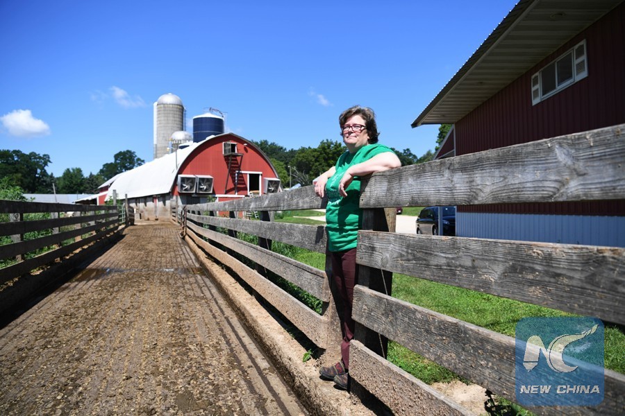 Photo taken on July 24, 2018 shows dairy farmer Sarah Lloyd standing in Neldell farm located in rural Dells of Wisconsin, the United States. Unexpected trade disputes initiated by the Trump administration have dealt a big blow to the U.S. dairy industry, and diminished hopes of survival for this medium-sized century-old farm. (Xinhua/Liu Jie)