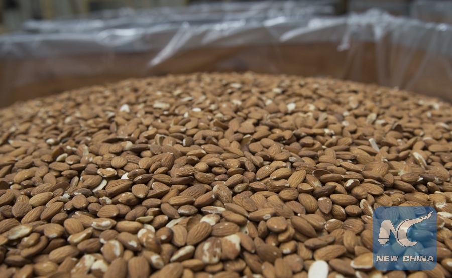 File Photo: Shelled almonds are seen at an almond processing plant in Modesto, California, the United States, on March 19, 2013. (Xinhua/Yang Lei)