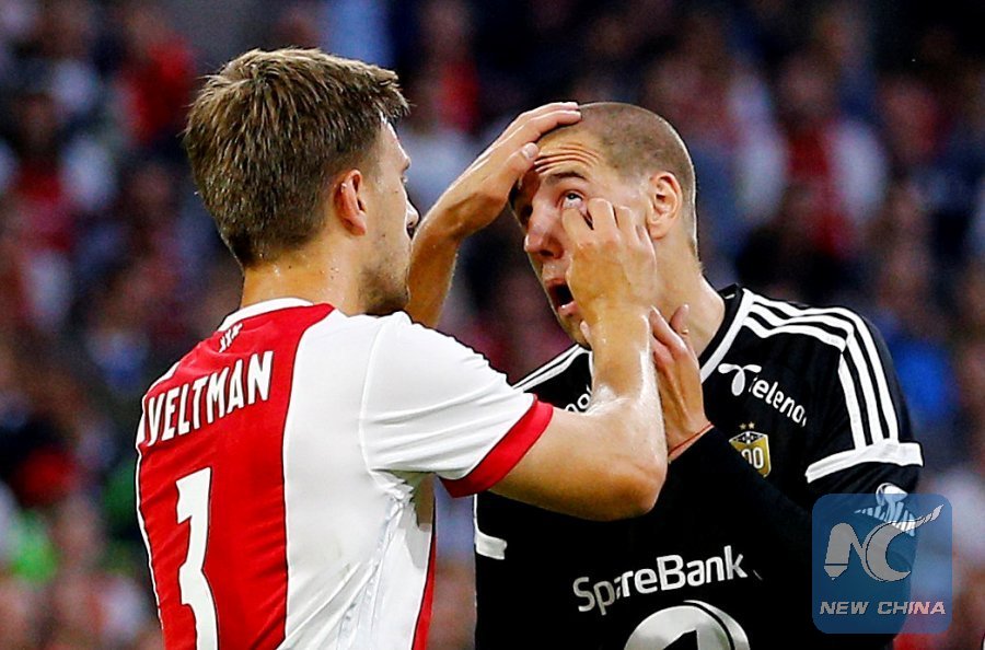 Soccer Football - Europa League - Playoffs - Ajax Amsterdam v Rosenborg BK - Amsterdam, Netherlands - August 17, 2017 Ajax's Joel Veltman helps Rosenborg's Milan Jevtovic with his contact lens (REUTERS/Michael Kooren)