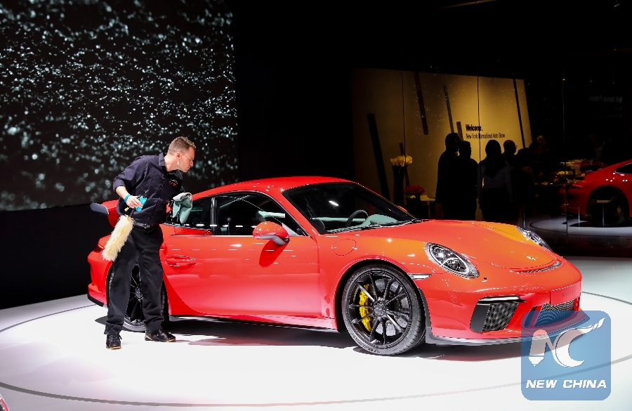 File Photo: A staff member cleans a Porsche 911 GT3 car during the media preview of the New York International Auto Show (NYIAS) in New York, the United States, April 12, 2017. (Xinhua/Wang Ying)
