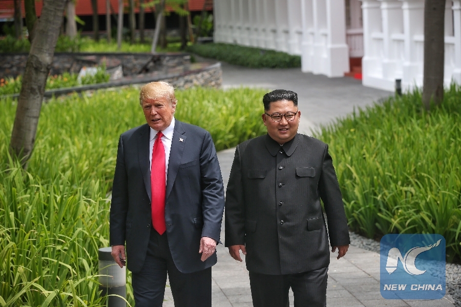 File Photo: Top leader of the Democratic People's Republic of Korea (DPRK) Kim Jong Un (R) and U.S. President Donald Trump take a walk during their summit meeting in Singapore on June 12, 2018. (Xinhua/Ministry of Communication and Information of Singapore)