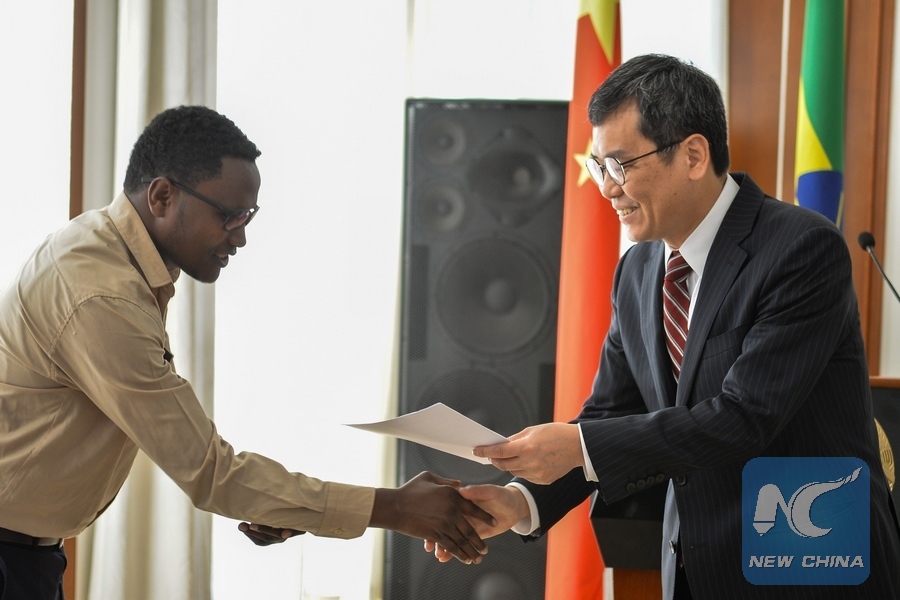 Tan Jian (R), Chinese Ambassador to Ethiopia awards an Ethiopian student a scholarship in Addis Ababa, capital of Ethiopia, Aug. 8, 2018. The Chinese government on Wednesday provided 29 scholarships to Ethiopian university students to pursue further studies in China. The 29 recipients will pursue graduate studies in Chinese universities both in social and natural science disciplines, majority of them set to take on their doctoral studies. (Xinhua/Michael Tewelde)