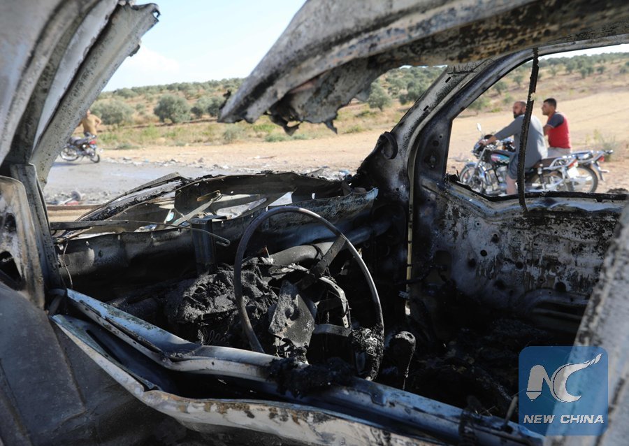 Syrians are seen through a burned vehicle at a site after an airstrike on the south of Idlib province on Sept. 8, 2018. (Xinhua/AFP)