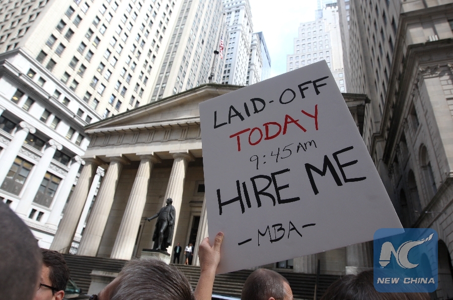 File Photo: A protestor holds a slogan outside the historic Federal Hall where U.S. President Barack Obama is speaking in the heart of Wall Street in New York Sept. 14, 2009. Obama, marking a year since Lehman Brothers collapsed, urged financial firms not to fight regulatory reform and urged Congress to pass his proposals by the end of the year. (Xinhua/Liu Xin)
