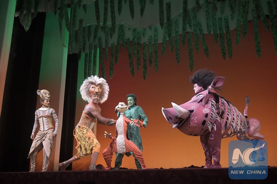 Actors perform in "The Lion King" in Singapore's Marina Bay Sands Theatre, on June 28, 2018. (Xinhua/Then Chih Wey)