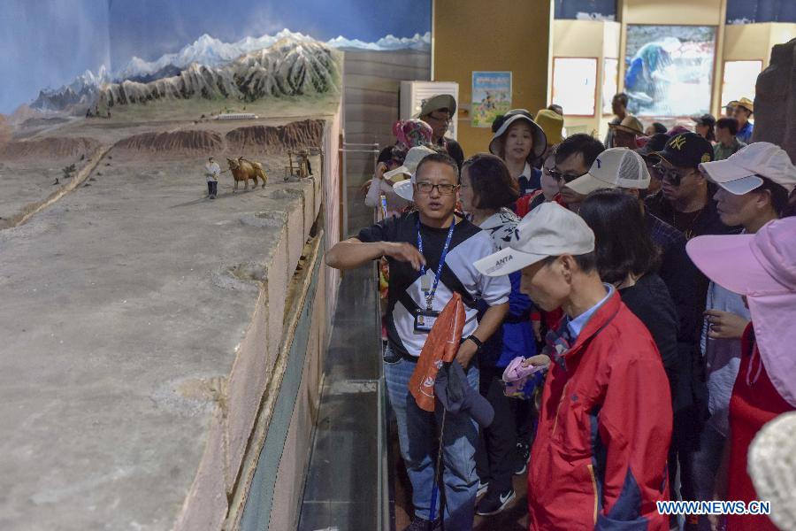 Tourists view a model of karez wells, which convey water from deep underground to the surface, at a park in Turpan, northwest China's Xinjiang Uygur Autonomous Region, Sept. 19, 2018. Xinjiang saw more than 105 million tourists in the first eight months of 2018, up 40.93 percent year on year, according to the Xinjiang tourism development commission. (Xinhua/Zhao Ge)