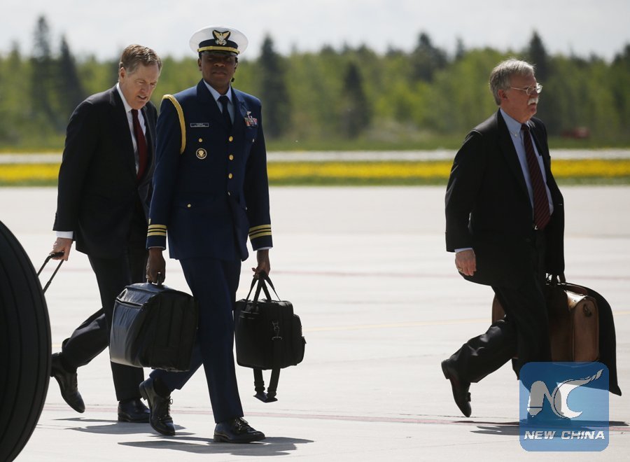 A U.S. military aide, carrying the "football" containing the launch codes for U.S. nuclear weapons, walks from Air Force One between U.S.Trade Representative Robert Lighthizer (L) and National Security Adviser John Bolton (R) as U.S. President Donald Trump arrives to attend the nearby G7 Summit in Charlevoix after landing aboard Air Force One at Canadian Forces Base Bagotville in La Baie, Quebec, Canada, June 8, 2018. (REUTERS Photo)
