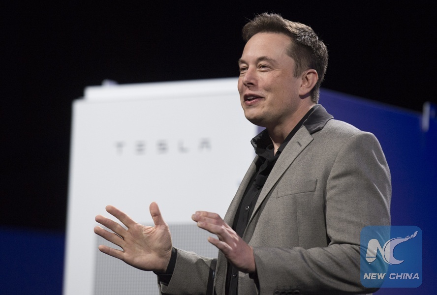 Elon Musk, CEO of Tesla, unveils a suit of batteries for homes, businesses, and utilities at Tesla Design Studio in Hawthorne, California, the United States, April 30, 2015. (Xinhua/Yang Lei)