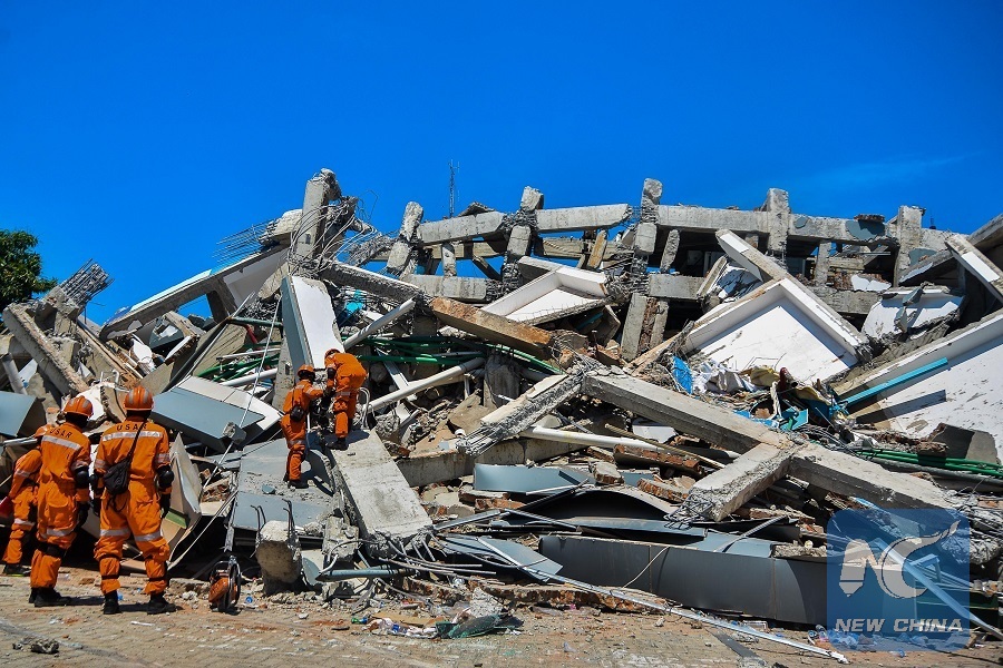 Rescue members work at a collapsed hotel in Palu, Central Sulawesi, Indonesia, on Oct. 1, 2018. (Xinhua/Iqbal Lubis)