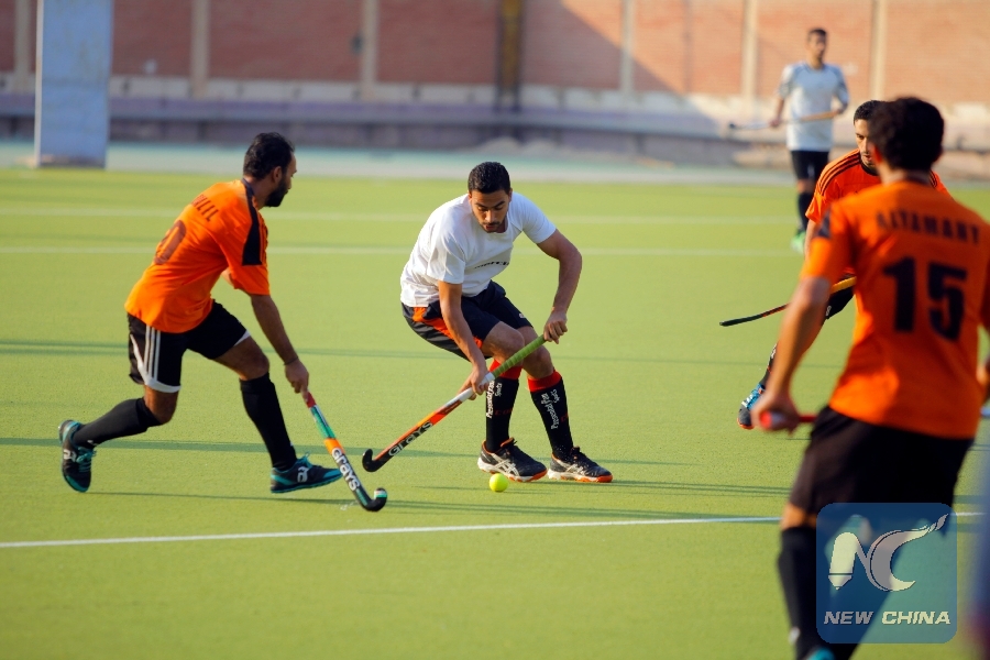Players are seen in the hockey field in Sharqiya, Egypt, on Sept. 18, 2018. (Xinhua/Ahmed Gomaa)