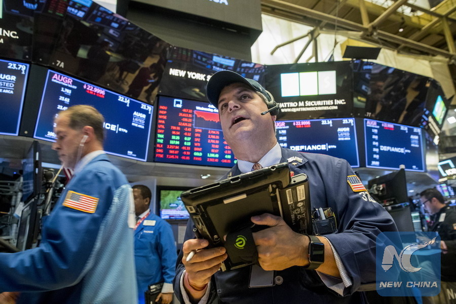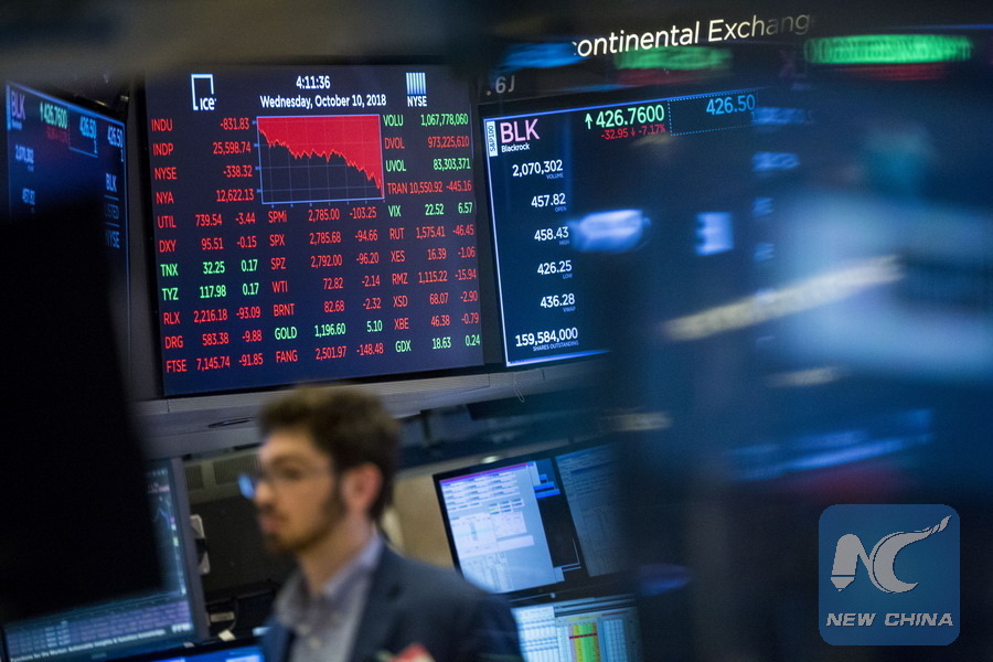Traders work at the New York Stock Exchange in New York, the United States, Oct. 10, 2018. U.S. stocks ended lower on Wednesday. The Dow fell 3.15 percent to 25598.74. (Xinhua/Wang Ying)