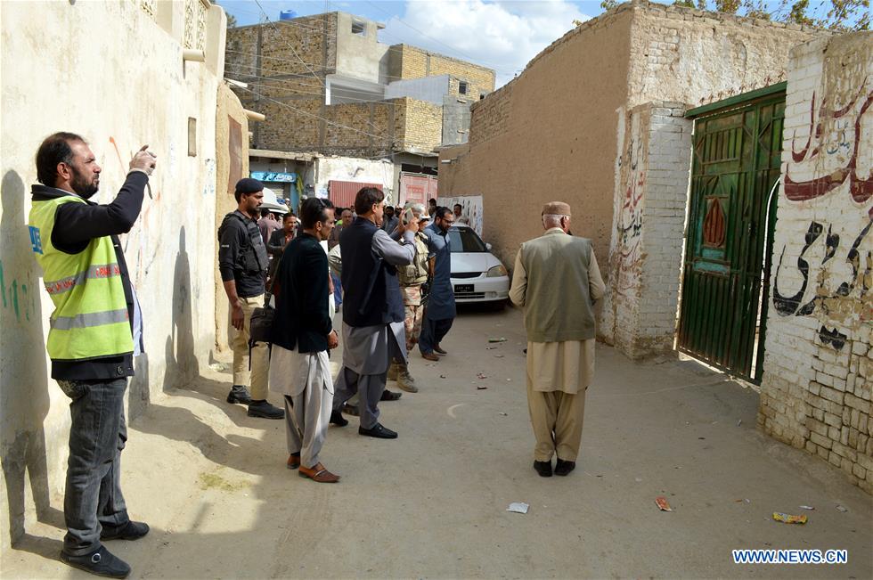 Pakistani security officials inspect the shooting site outside a school in southwest Pakistan's Quetta on Oct. 24, 2018. At least four kids were injured when unknown gunmen attacked a school in Pakistan's southwest Quetta city on Wednesday. (Xinhua/Irfan)