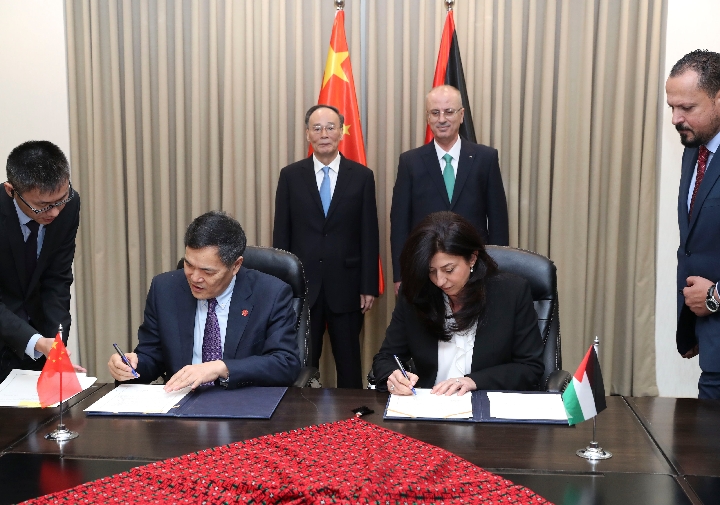 Chinese Vice President Wang Qishan and Palestinian Prime Minister Rami Hamdallah witness the signing of a memorandum of understanding on starting China-Palestine free trade talks and other documents in Ramallah, Oct. 23, 2018. (Xinhua/Pang Xinglei)