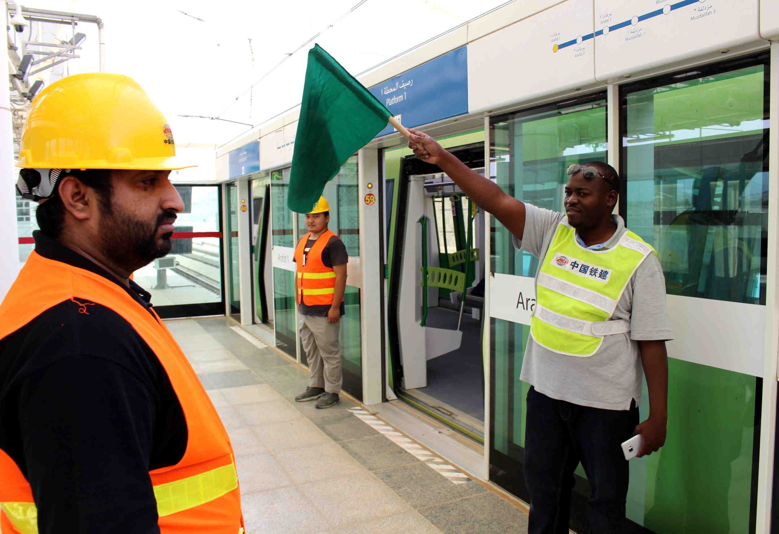 A worker signals during the testing of the Mecca Light Rail in Mecca, Saudi Arabia, on June 20, 2018. (Xinhua/Dong Liwei)