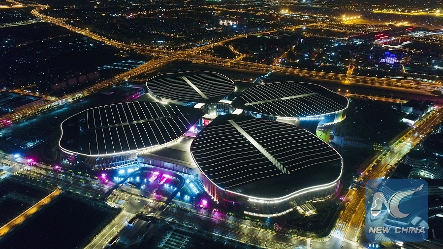 Photo taken on Oct. 21, 2018 shows a night view of the National Exhibition and Convention Center (Shanghai) in Shanghai, east China. (Xinhua/Ding Ting)