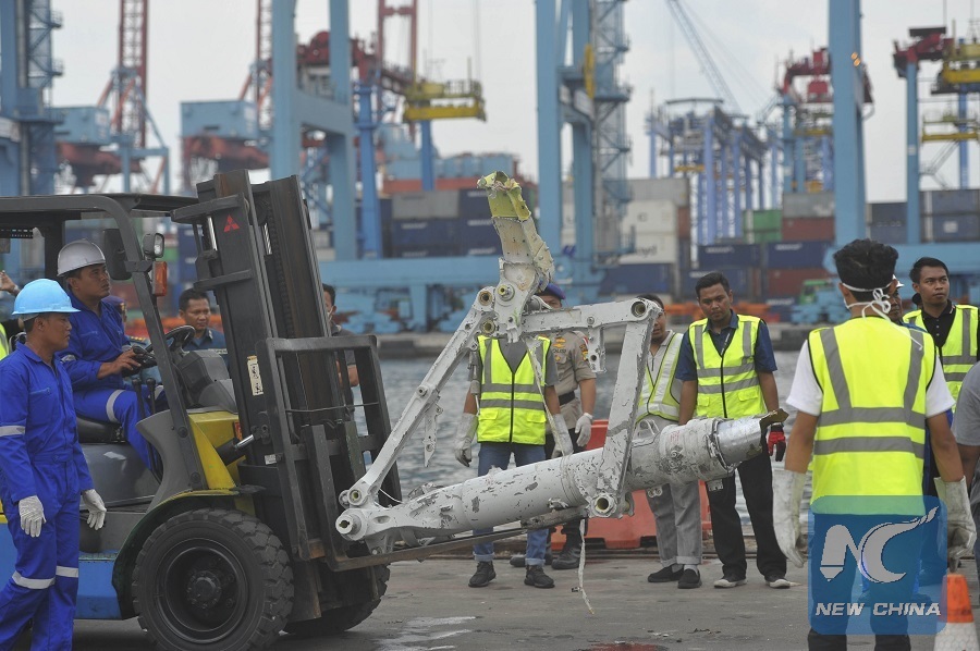 Officials load wreckage from the crashed Lion Air plane for investigation at Tanjung Priok Port in Jakarta, Indonesia, Nov. 5, 2018. (Xinhua/Zulkarnain)