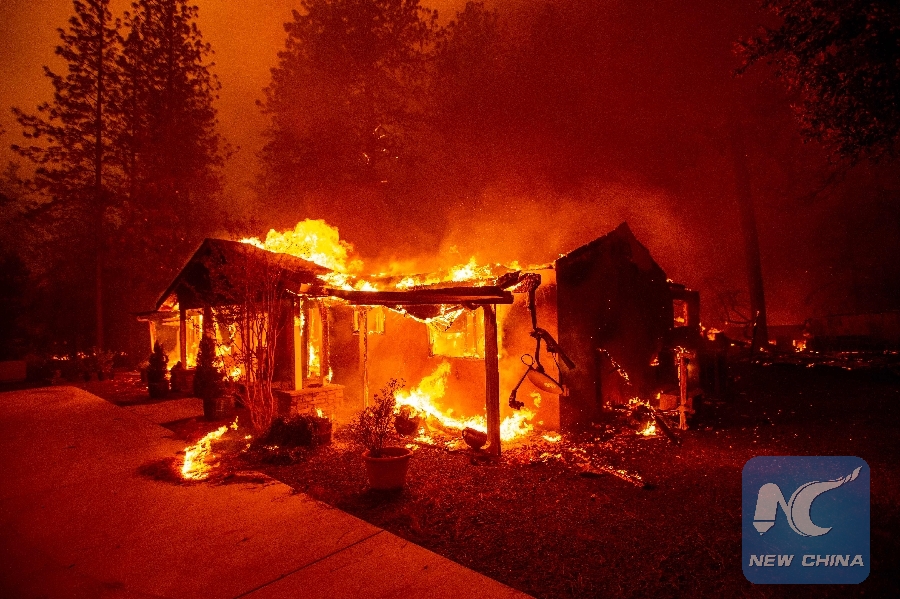 LOS ANGELES, Nov. 8 (Xinhua) -- A wildfire dubbed Camp Fire has burned down up to 1,000 homes in the U.S. city of Paradise in Northern California, with multiple fatalities reported, local authorities said Thursday night.