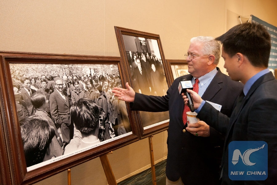 File Photo: Chas Freeman Jr., a veteran diplomat who served as Richard Nixon's interpreter when the then U.S. president visited China in 1972, gestures in front of a 1972 photo capturing the moment when a group of Chinese table tennis players visited the White House, during a photo exhibition organized by Xinhua News Agency in Washington, the United States, on June 6, 2011. (Xinhua/Zhu Wei)