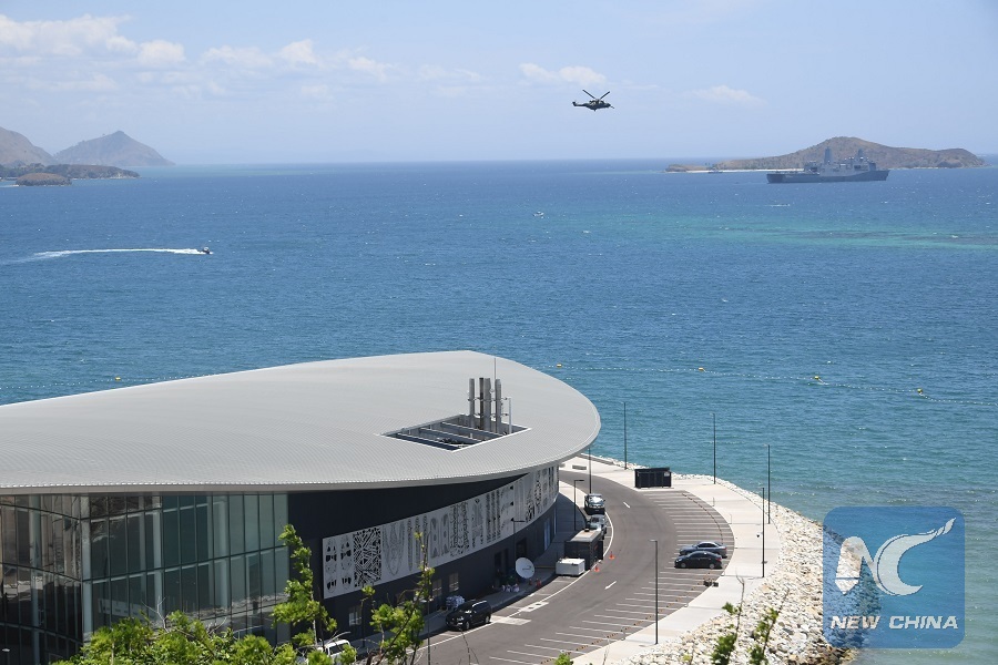 A helicopter flies near the Leaders' Conference Centre in Port Moresby, Papua New Guinea, on Nov. 14, 2018. (Xinhua/Lui Siu Wai)