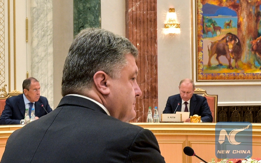 File Photo: Ukraine's President Petro Poroshenko (front), Russia's President Vladimir Putin (R) and Foreign Minister Sergei Lavrov attend a meeting with high-ranked officials representing Russia, Belarus, Kazakhstan, Ukraine and the European Union in Minsk, Aug. 26, 2014. (Xinhua/REUTERS)