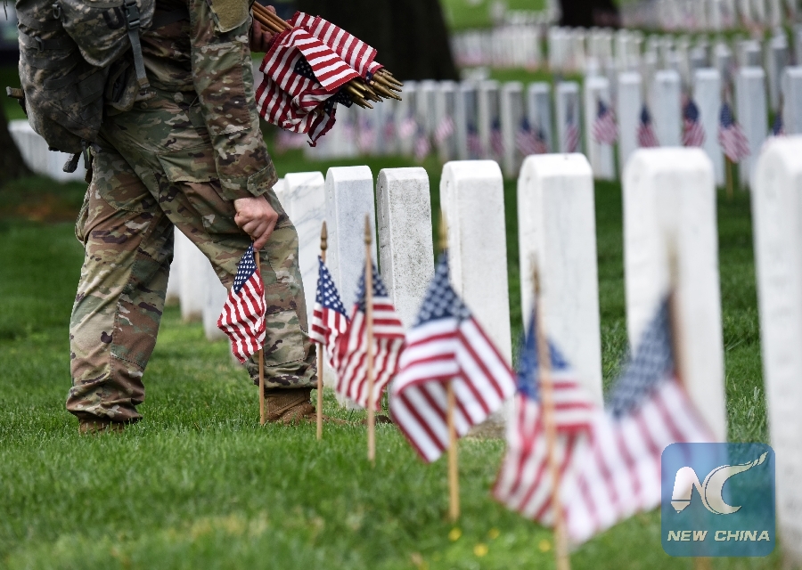 File Photo: A soldier from the 3rd U.S. Infantry Regiment places flags at grave sites during the "Flags-In" ceremony at the Arlington National Cemetery in Arlington, Virginia, the United States, on May 25, 2017. (Xinhua/Yin Bogu)