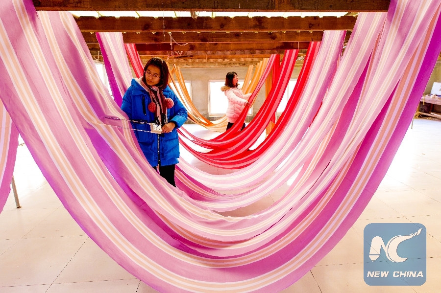 Workers check the humidity of cloth at a workshop in Jizhou District of Hengshui, north China's Hebei Province, Dec. 25, 2018. Local impoverished households are able to increase income through learning a traditional cloth weaving technique of Jizhou, a provincial intangible cultural heritage, under the guidance of the inheritors of the technique. (Xinhua/Li Xiaoguo)