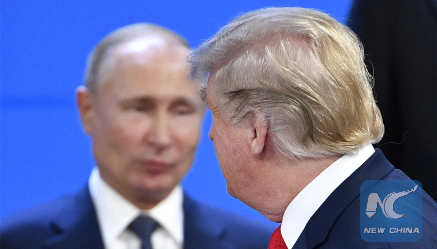 U.S. President Donald Trump (R) looks at Russia's President Vladimir Putin as they take their places for a family photo during the G20 Leaders' Summit in Buenos Aires, on November 30, 2018. (AFP Photo)