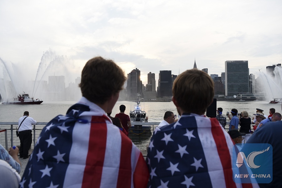 People watch the performance of the boat of the New York City Fire Department before the firework event to celebrate the Independence Day of the United States in New York City, July 4, 2018. (Xinhua/Han Fang)