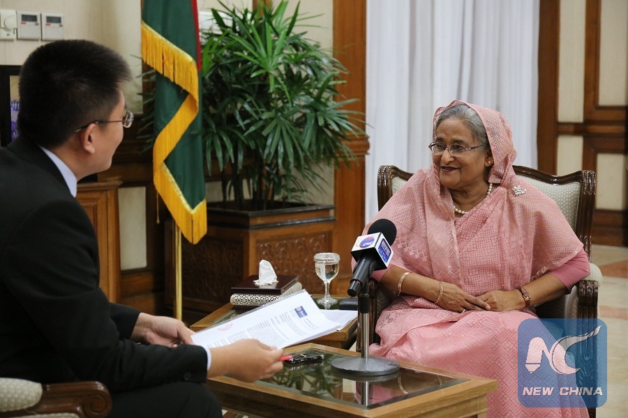 The photo shows Bangladeshi Prime Minister Sheikh Hasina (R) receives an interview with Xinhua in Dhaka, Bangladesh, Oct. 11, 2016. (Xinhua/Lin Hao)