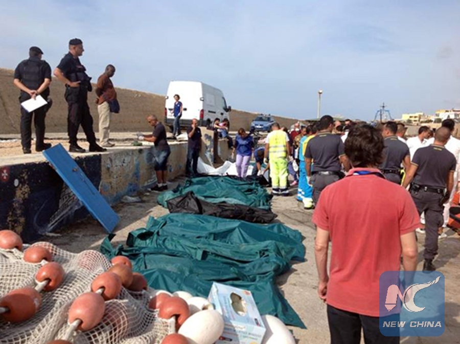 Bodies of migrants are seen at the pier of southern Italian island of Lampedusa, Oct. 3, 2013. The death toll from the sinking of a migrant boat off an Italian island carrying about 500 people could well top 200, according to local media reports. (Xinhua)