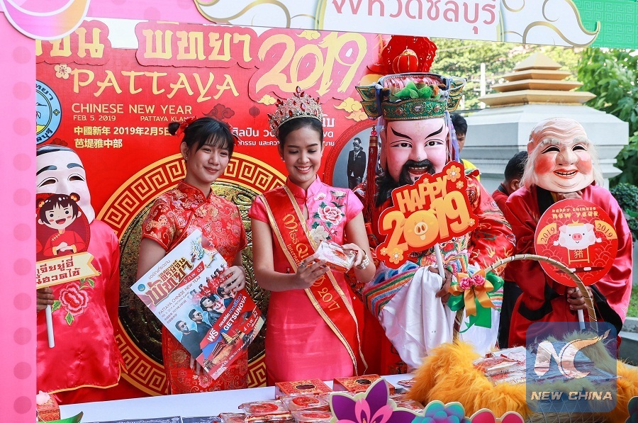 The photo shows representatives of Thailand's eastern Chonburi Province promote their celebration activities at a press conference on celebration of Chinese New Year held by the Tourism Authority of Thailand (TAT) in Bangkok, Thailand, Jan. 24, 2019. (Xinhua/Zhang Keren)