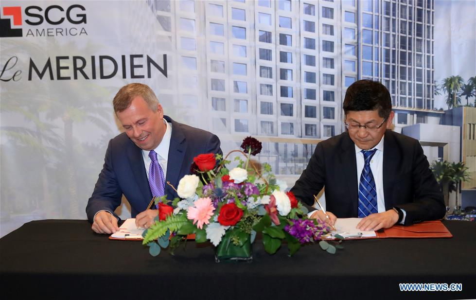 Michael J. Deitemeyer (L), president and CEO of Interstate Hotels & Resorts, signs a management agreement with Danny Wei, executive vice president of Shanghai Construction Group America (SCGA) , for a new hotel project in Los Angeles, the United States, Jan. 30, 2019. The new hotel, located in the city of Garden Grove, 60 km southeast of downtown Los Angeles, will be developed by SCGA, a wholly owned subsidiary of Shanghai Construction Group (SCG) and headquartered in New York City. The construction work on the Le Meridien, designed with a modern twist, is expected to start in the third quarter of 2019 and the hotel to open at the end of 2021. Then Interstate Hotels & Resorts will manage the hotel, which features 400 luxury guest rooms, for the owner SCGA. (Xinhua/Li Ying)