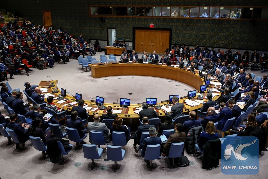 Photo taken on Feb. 4, 2019 shows the United Nations Security Council high-level debate "Mercenaryactivities as a source of insecurity and destabilization in Africa," at the UN headquarters in New York. (Xinhua/Li Muzi)