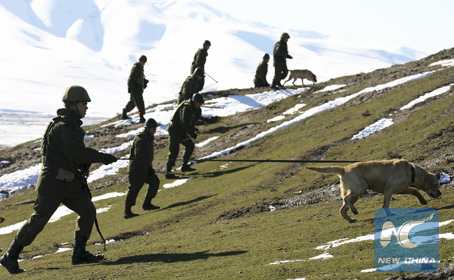 Russian servicemen walk during an operation to search for unexploded military shells, which were used during previous military war games, outside Dushanbe, Tajikistan on Jan. 17, 2012. (Reuters)