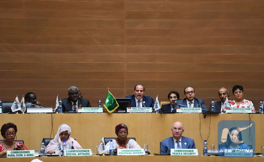 Egyptian President Abdel-Fattah al-Sisi (C 2nd Row) speaks at the closing session of the 32nd African Union (AU) summit at the AU headquarters in Addis Ababa, Ethiopia, Feb. 11, 2019. (Xinhua/Li Yan)