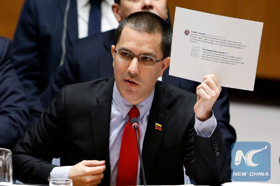 File Photo: Venezuelan Foreign Minister Jorge Arreaza holds a copy of the screenshot of U.S. President Donald Trump's tweet as he addresses a United Nations Security Council emergency meeting on the situation in Venezuela, at the UN headquarters in New York, Jan. 26, 2019. (Xinhua/Li Muzi)