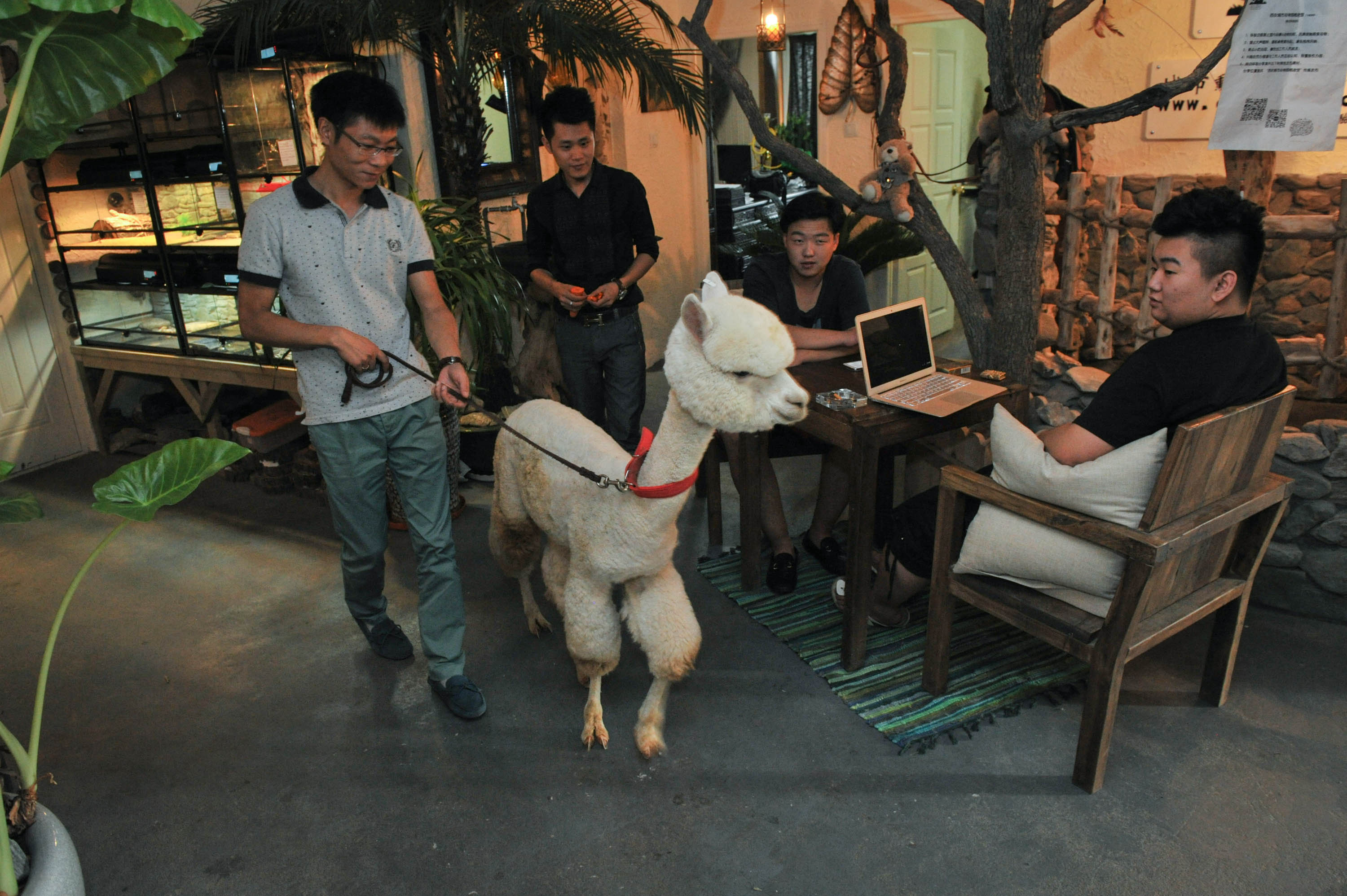 Photo taken on July 30, 2014 shows employees at a pet shop play with an alpaca in Xi'an, NW China's Shaanxi Province. (Xinhua/Ding Haitao)