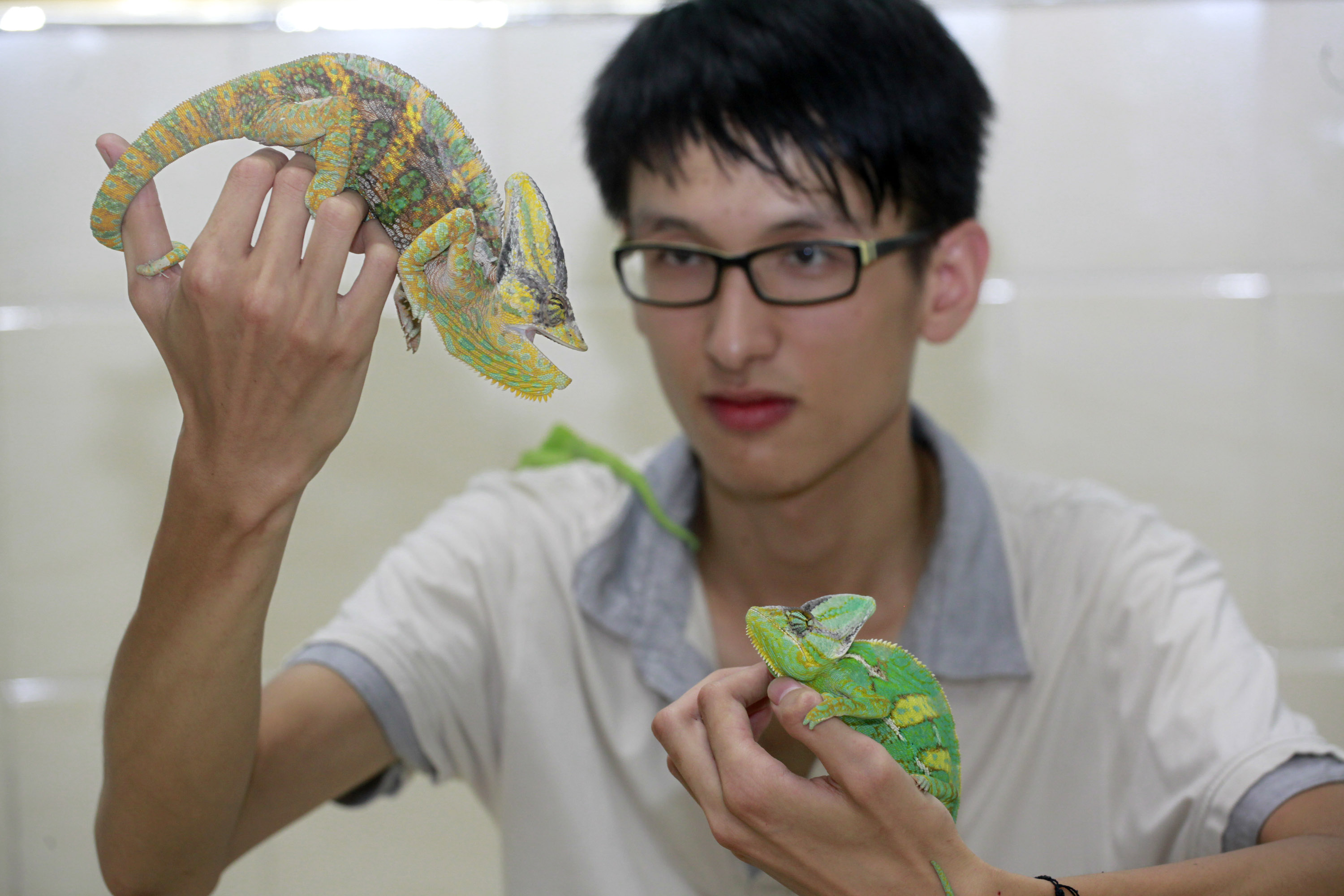 A young Chinese plays with his chameleon pets in Guangxi Zhuang Autonomous Region on June 18. 2013. (Xinhua/Zhang Cunli)