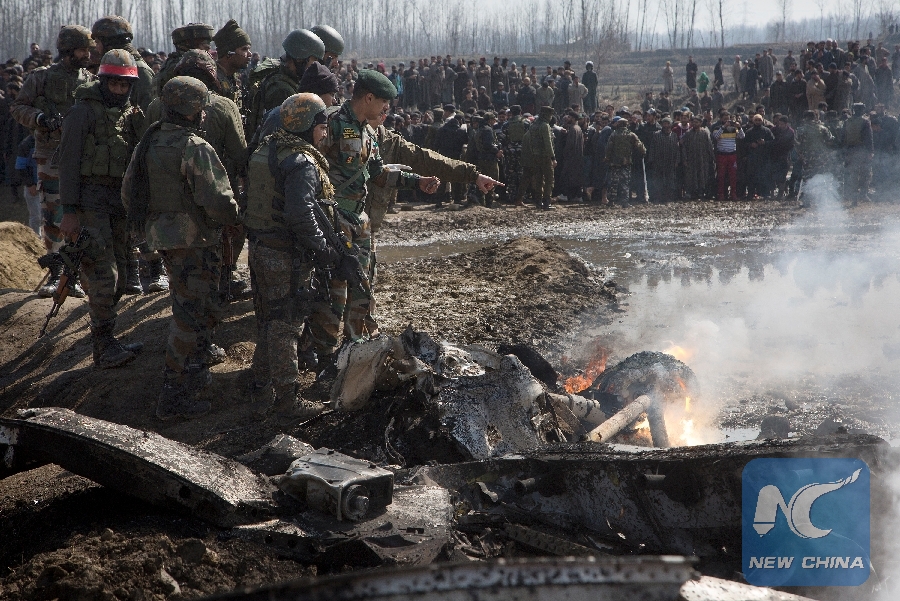 Indian army officials inspect the wreckage of an Indian aircraft after it crashed at village Garend Kalan of Budgam, about 34 km south of Srinagar city, the summer capital of Indian-controlled Kashmir, Feb. 27, 2019. A pilot and a co-pilot of Indian Air Force (IAF) were killed after a Mi-17 jet crashed Wednesday in Indian-controlled Kashmir, Indian officials said. Meanwhile, Pakistan army said on Wednesday the Pakistan Air Force has shot down two Indian fighter jets inside Pakistani airspace and ground troops arrested one pilot of the destroyed jet, according to a military statement. (Xinhua/Javed Dar)
