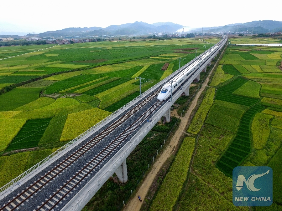 Photo taken on July 19, 2016 shows a high-speed train driving past fields in Tianyang County, south China's Guangxi Zhuang Autonomous Region. (Xinhua/Wei Wanzhong)