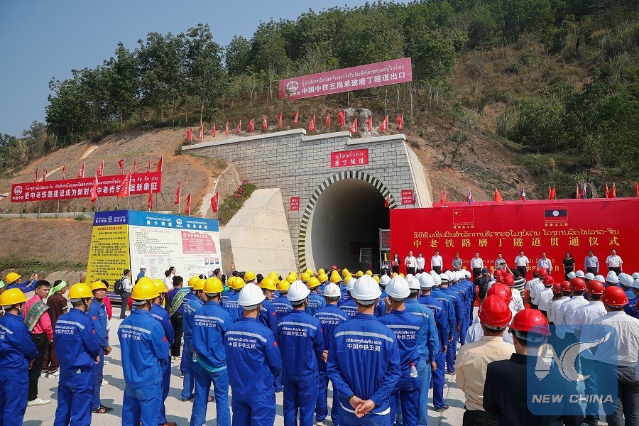 Photo taken on March 21, 2019 shows the drilling-through ceremony of Boten Tunnel along the China-Laos railway in Boten of Laos. (Xinhua/Wang Jingqiang)
