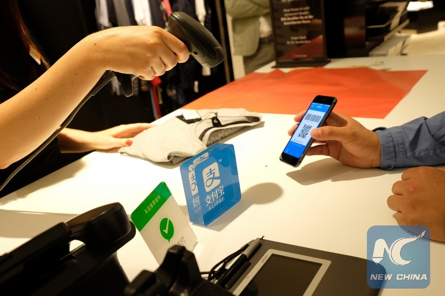 Photo provided by German department store retailer Breuninger shows a customer using Alibaba's Alipay at Breuninger store in Dusseldorf, Germany, June 29, 2018. Breuninger on Friday announced to introduce two Chinese mobile payment platforms -- Alibaba's Alipay and Tencent's Wechat Pay. (Xinhua/Breuninger)