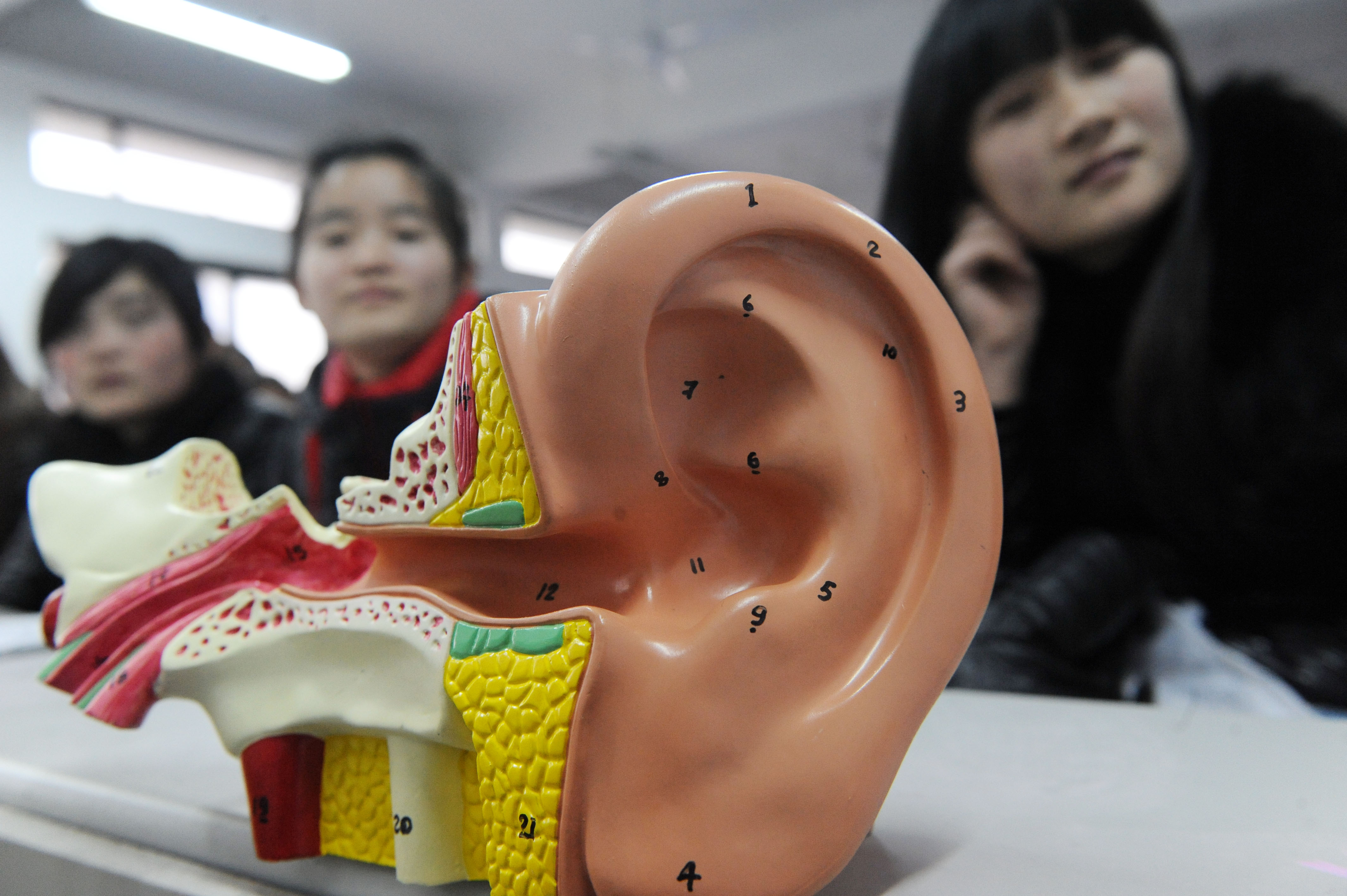 Students of Bozhou Vocational and Technological Institute in east China's Anhui Province are learning the structure of ears and the ways to protect hearing. (Xinhua/Zhang Yanlin)