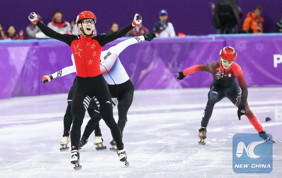 Wu Dajing (L) of China celebrates victory after men's 500m final of short track speed skating at the 2018 PyeongChang Winter Olympic Games at Gangneung Ice Arena, Gangneung, South Korea on Feb. 22, 2018. (Xinhua/Han Yan)