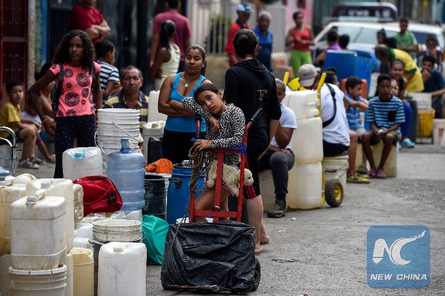 People line up with cans and tanks to collect water at Petare neighborhood in Caracas on April 1, 2019. (Xinhua/AFP)