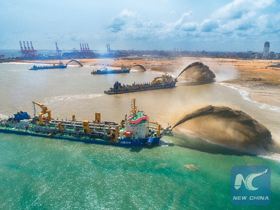 Chinese Dredgers work at the construction site of the Colombo Port City project in Colombo Port City, Colombo, Sri Lanka in this June 20, 2018 file photo. (Xinhua)