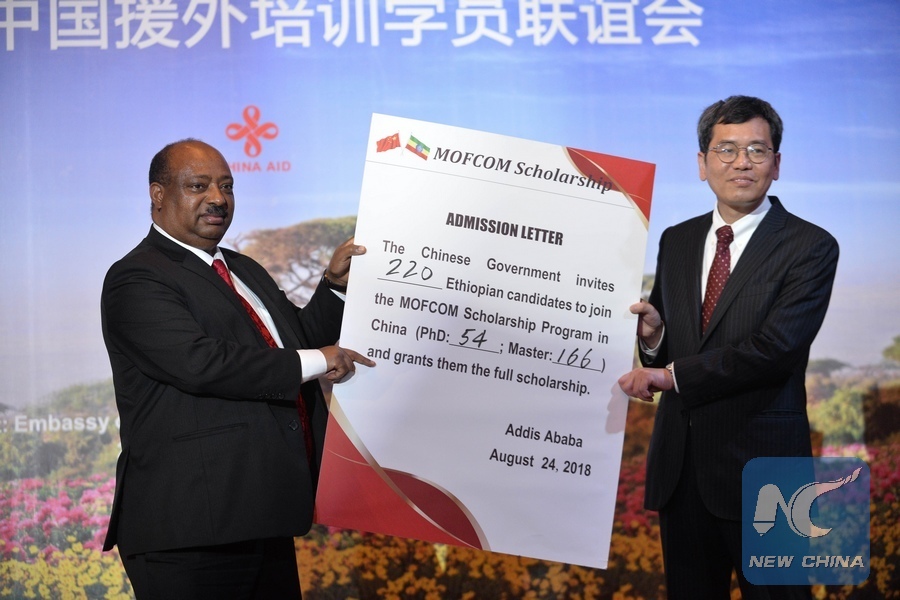 Tan Jian (R), Chinese Ambassador to Ethiopia hands over a scholarship grant agreement for 220 post graduate students during a Chinese Government Training Program Fellowship Reception at the Sheraton Hotel in Addis Ababa, capital of Ethiopia, Aug. 24, 2018. The Chinese government has provided more than 1,450 scholarship opportunities to Ethiopians in various academic and training areas during the first eight months of 2018, the Chinese Embassy in Ethiopia revealed. (Xinhua/Michael Tewelde)