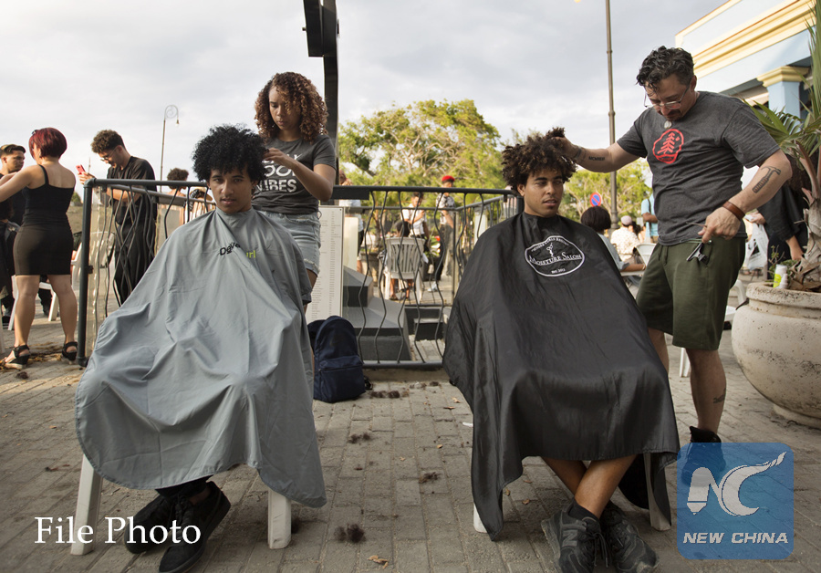 Two people get haircuts during a free session for people with afros and curly hair, with the participation of guest hairdressers from the US, Australia and Puerto Rico, in Havana, Cuba, 26 April 2019. (EPA PHOTO)