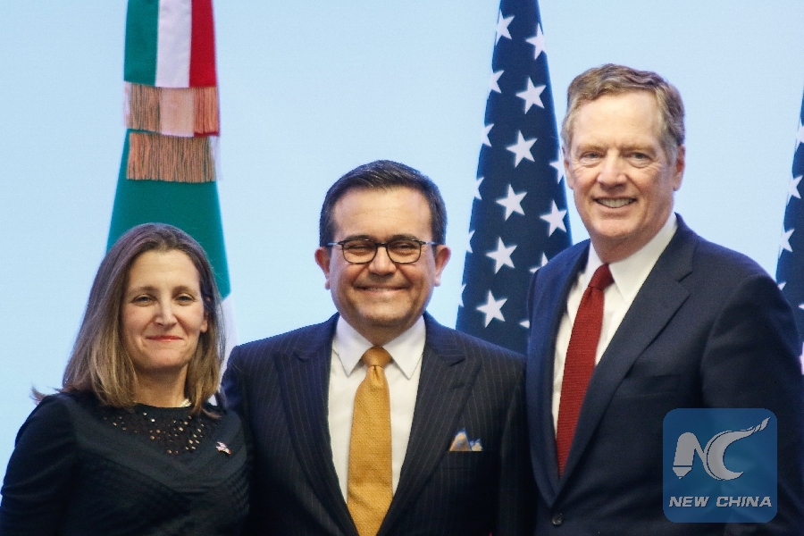 Mexican Economy Minister Ildefonso Guajardo (C), U.S. Trade Representative Robert Lighthizer (R), and Canadian Foreign Minister Chrystia Freeland pose for photos during a press conference after the seventh round of talks to modernize the North American Free Trade Agreement (NAFTA), in Mexico City, capital of Mexico, on March 5, 2018. (Xinhua/Francisco Canedo)