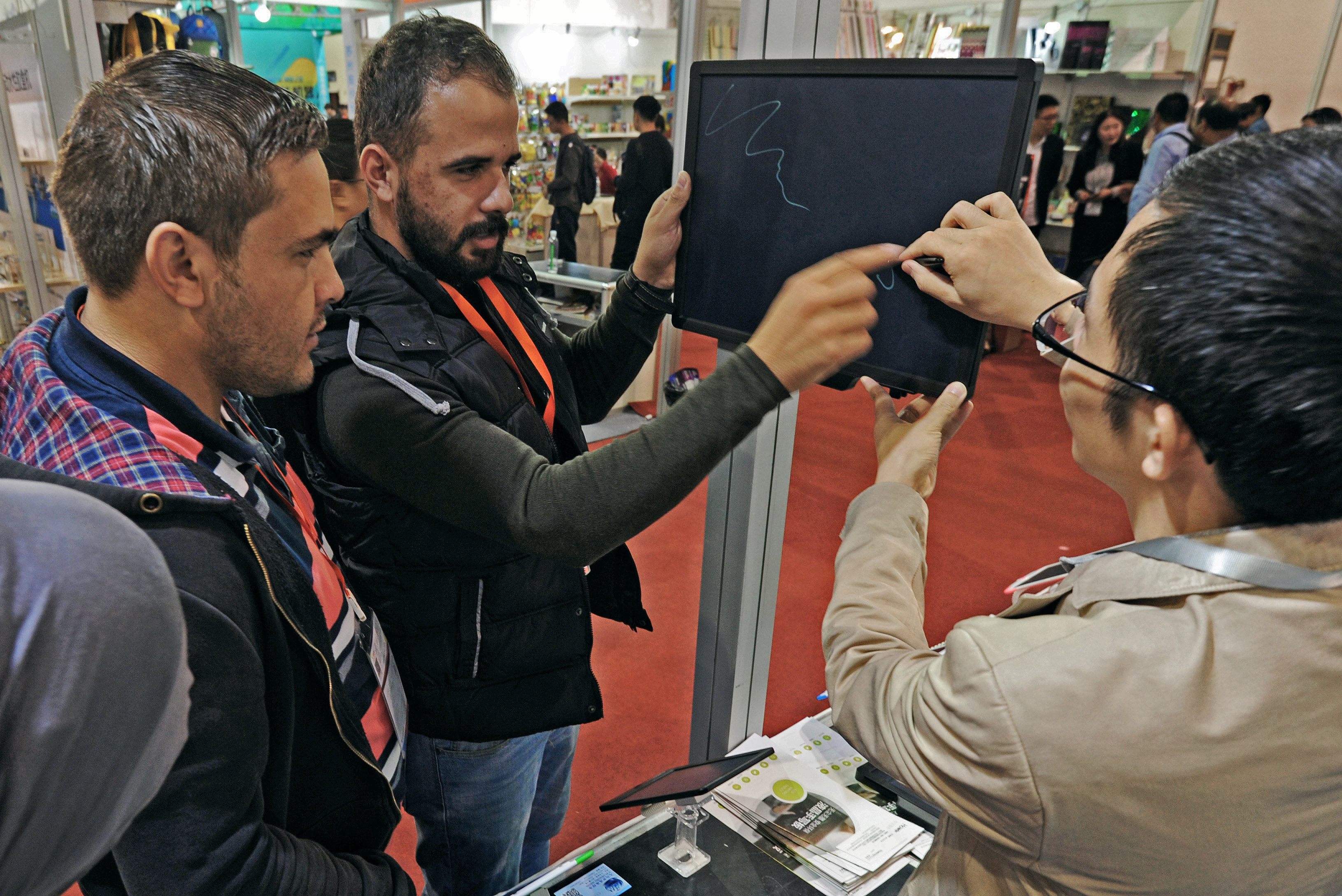 Indian businessmen try out an electronic board at the Yiwu International Trade City in Yiwu, a city famous for selling small goods in east China's Zhejiang Province, Oct. 21, 2018. (Xinhua/Tan Jin)